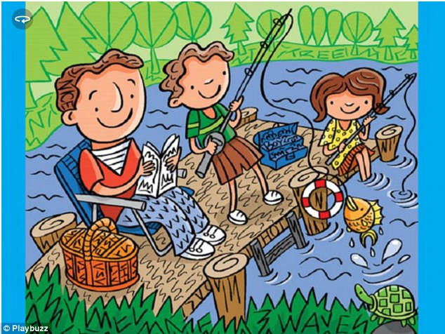 يوضح المشهد أسرة تقضي العطلة فالأب يقوم بقراءة الصحيفة والإبنة تصطاد الأسماك بجانبه ويصور المشهد عطلة سعيدة للأسرة .